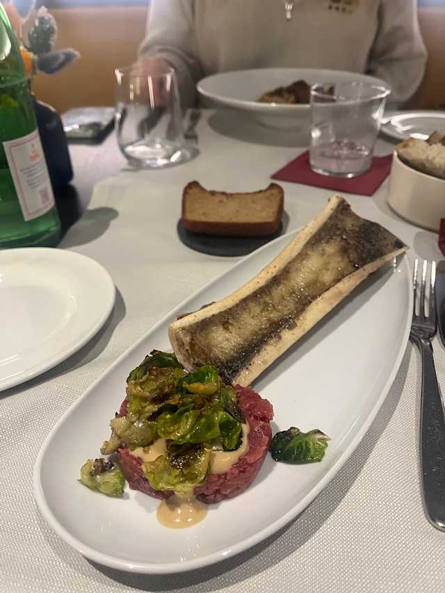 - Beef marrow and tartare, served with charred Brussels sprouts, bagna cauda, and banana bread