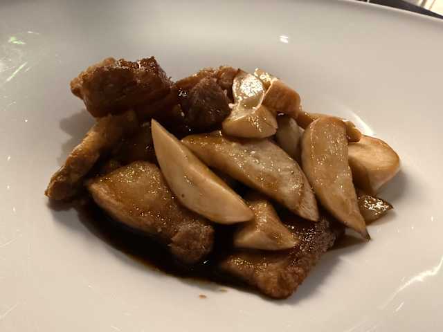 - Pork belly glazed with Lapsang tea and mandarin, celeriac cream, and king oyster mushrooms