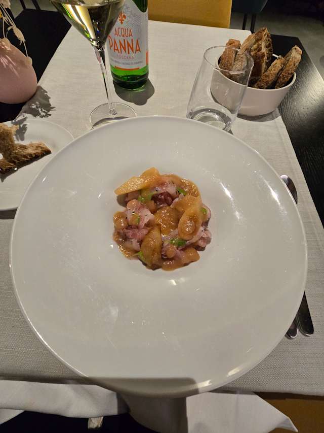 - Amberjack crudo with warm pear and ginger juice, pear mustard, and thyme