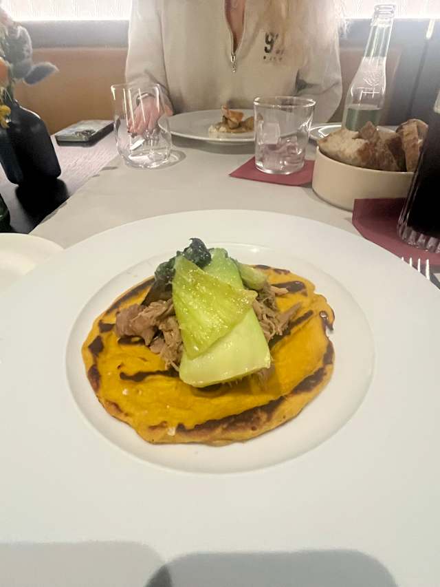 - Spicy duck, seared pakchoi, pumpkin and spring onion fritters
