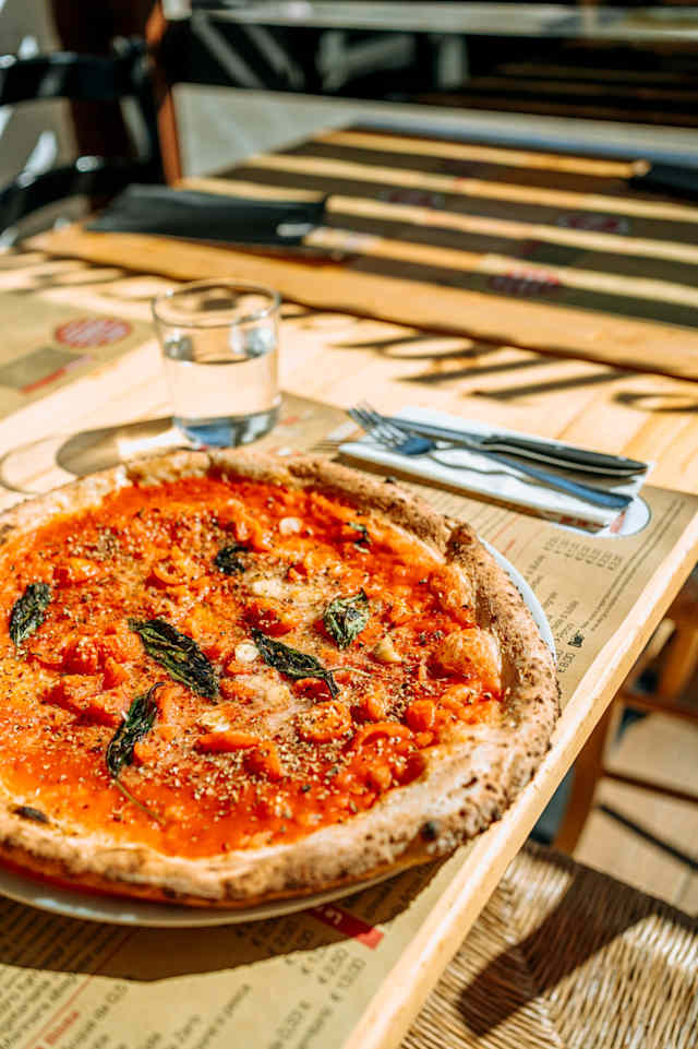 - Pomodoro, fior di latte fior d'agerola, acciughe, capperi, olive nere di gaeta, origano, basilico