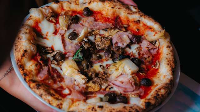 - Pomodoro, mozzarella, prosciutto cotto, funghi, salame, carciofi, olive nere, basilico