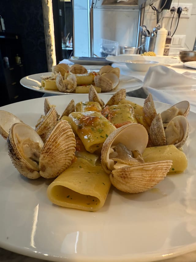 - Spaghetti quadrati con vongole e crema di aglio nero