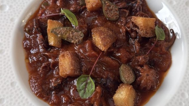 - Polipetti in lunga cottura con pelati san marzano DOP, olive taggiasche e fiori di capperi