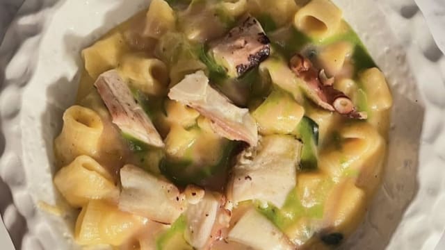 - Pasta e patate della tradizione napoletana con provola di bufala aumicata, polpo e parmigiano reggiano 20 mesi.