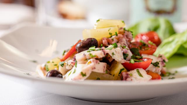 Polpo* scottato con crema di burrata di bufala dop, olive taggiasche e pesto di basilico di prà