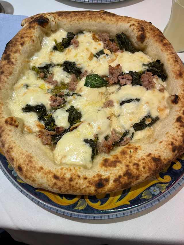 - Salsiccia, melanzane, cipolla rossa, provola, pomodorini, in uscita scaglie di grana, basilico e olio evo