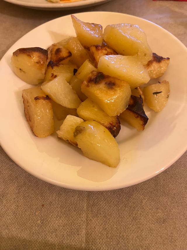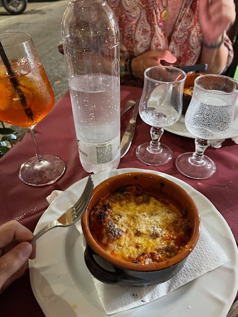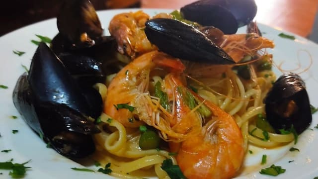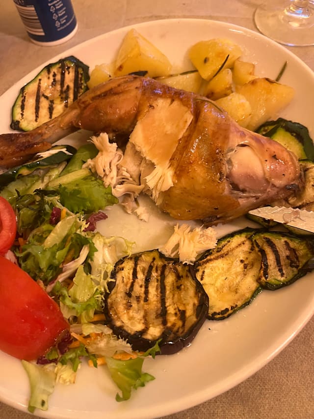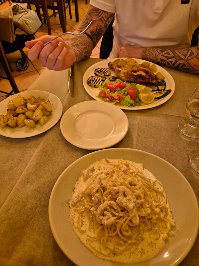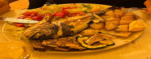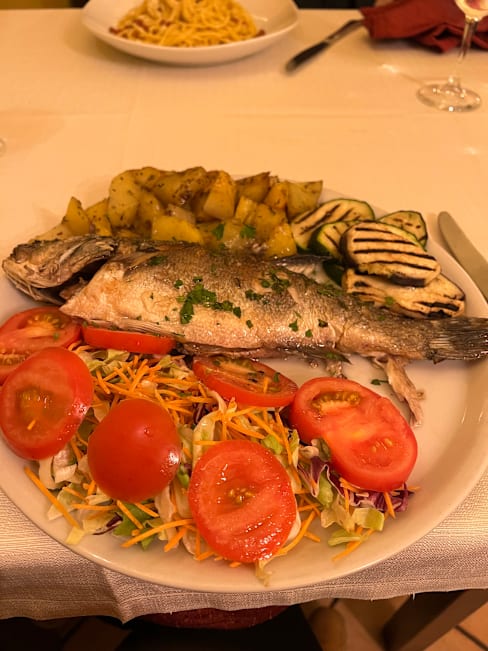 5.5/10The restaurant is very basic, it did have some tables outside but as it was not so hot we went inside. Only one person serving everyone so a bit slow, he was friendly. Got the house white 1 lt carafe of wine l don’t recommend it at all it was not pleasant, but it was very cheap starter we just had tomato and a ham bruschetta, very basic but ok, the meal took a bit of time to come as l had fish My friend had the lasagna which he said was nice, l hade a hole sea base (that was gutted but hole with head on and all the bones ) the fish was very nice and hot, it came with potatoes that are cold and some griddled courgette aubergine that was also cold and chopped lettuce and tomato. The bill was not quite correct as the wine was changed more as we had apparently an old menu that said it was 4 euros less, he did take it off the bill with no problem