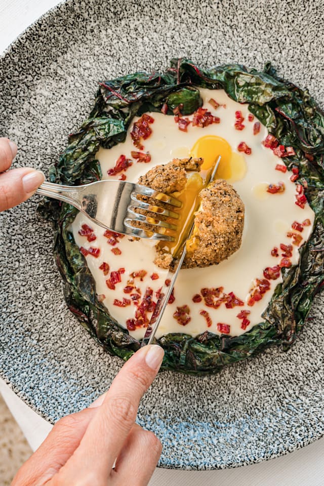 Fonduta di grana, foglie di bieta arrostite