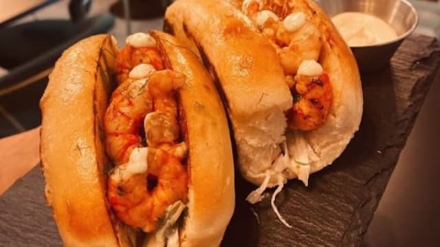 Panino soffice al vapore con gamberi saltati al lime, iceberg ed emulsione di mayo