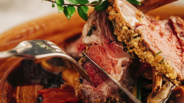 Rack of lamb* with apricot and almond crust, served with celery root purée and wasabi