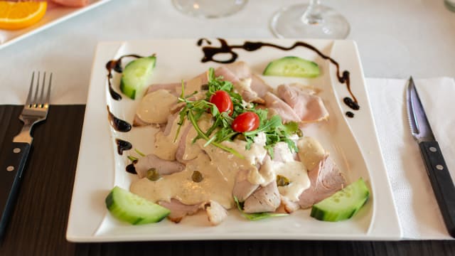 Dun gesneden kalfsvlees met huisgemaakte tonijn-mayonaise, rucola en kappertjes.