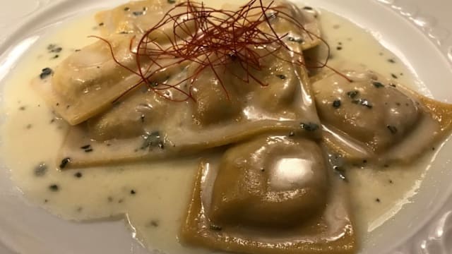 Handmade fresh pasta prepared according to tradition, served with a mildly spicy aglione garlic sauce from the Valdichiana.