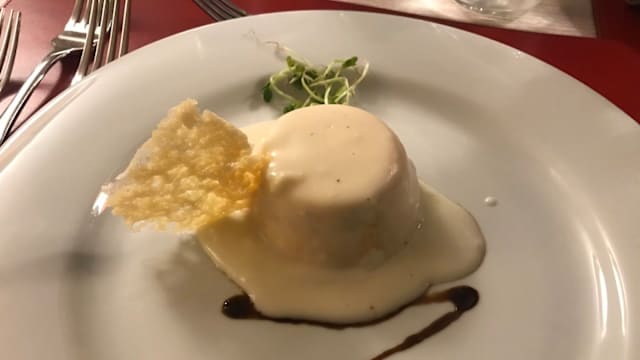 A soft flan with a flavorful heart of Pienza pecorino cheese, contrasted by the sweetness of pear cream and the tangy freshness of mixed berries.