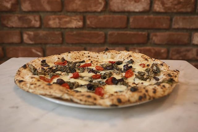 Pomodoro biologico, prosciutto cotto, fior di latte campano, carciofi, funghi, olive nere di caiazzo, olio EVO DOP, basilico