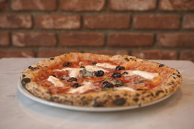 Alici di cetara, salsa di pomodoro bio, fior di latte di agerola, capperi di salina (slow food), olive nere caiazzane (slow food), origano del monte saro, aglio dell'ufita, olio EVO DOP (pregio) e basilico