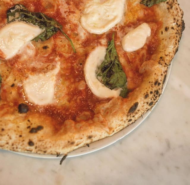 Salsa di pomodoro bio, mozzarella di bufala campana DOP, parmigiano reggiano 24 mesi, olio EVO DOP (pregio) e basilico