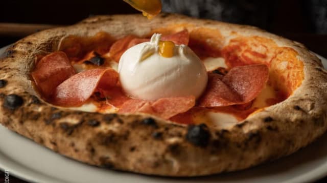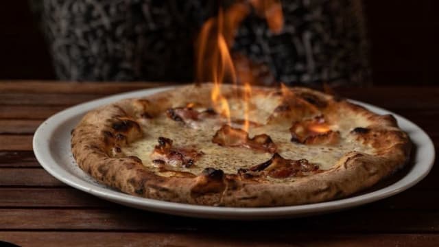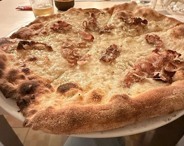 Fior di latte, peperoni, olive verdi, bacon croccante - al fuoco