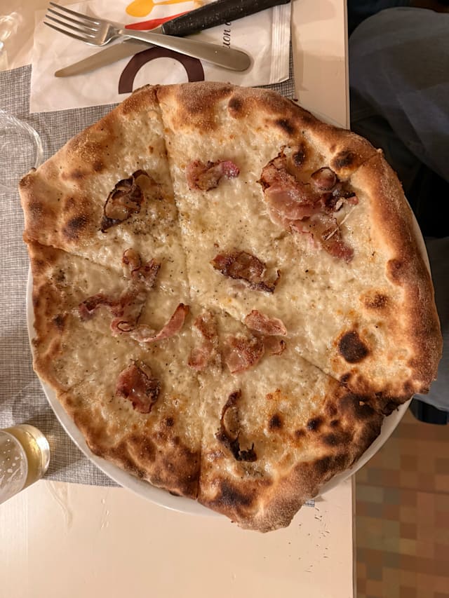 Fior di latte, crema di pecorino romano dop, pepe nero, guanciale croccante