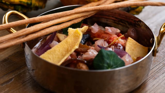Riso Vialone, guanciale croccante, cremoso al pecorino, cipolla in agro, salsa ai tre pomodori e riduzione di mosto d’uva