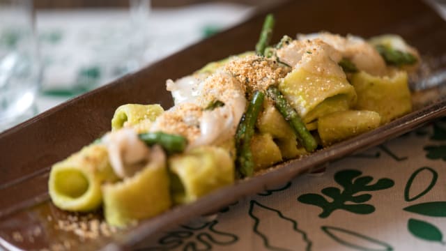 Tonnarello, cremoso di pistacchio e stracciatella, speck croccante (