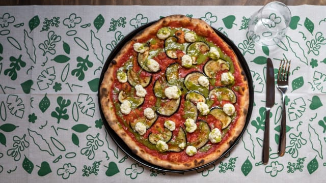 Mozzarella, patate, mortadella, stracciatella, pesto di basilico e granella di pistacchio