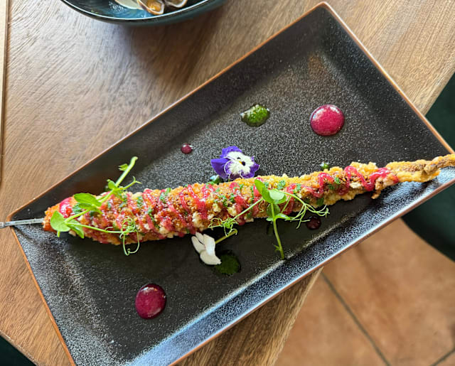 Tentacolo di polpo pastellato in farina di riso, pangrattato e birra, servito con crema alla cipolla rossa e salsa verde