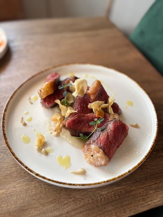 Tagliata di manzo su crema di topinambur e perlage di tartufo