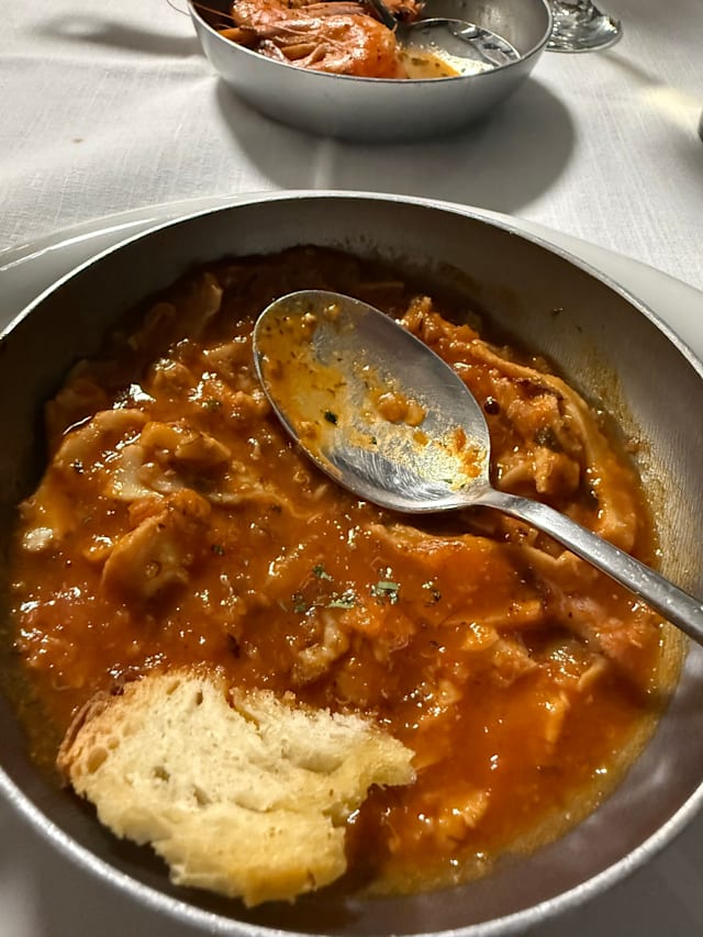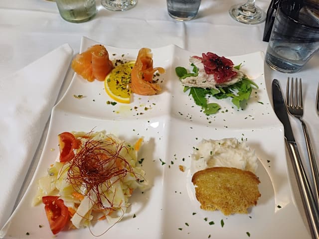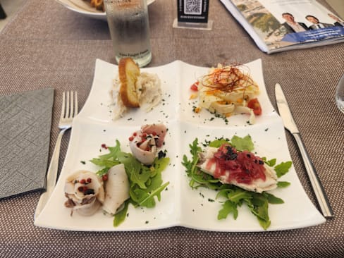 5/10As this restaurant was rated 1st on TripAdvisor we were expecting great things but were sadly disappointed. The restaurant was brightly lit and totally without atmosphere. Although it was fairly quiet when we arrived and there were several waiters we still had to wait about 15 minutes before being given a menu. Our pasta dish arrived after one hour. My husband and I had different pasta dishes which were both excellent. We had different fish dishes too, both disappointing, some of the fish in the fritto misto were overcooked, my tuna was rather bland.