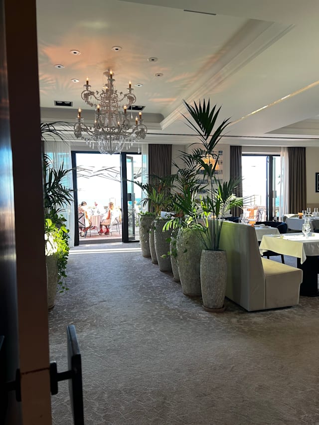 2/10Attatched to the `stunning` 5 star Real Grande Italia Hotel....Cascais. We do Not include the fantastic Real Grande Italia in this experience. We went into the Restaurant with great hopes of a lovely Xmas evening dinner. But after walking in to the `Sterile` and Xmas decoration-less room, it seemed a bad sign...with only another 11 peeps in there. `Pedro` our waiter went thro` the `cheap meat cuts and generally` VERY overpriced food... explaining mostly how some old cigar smoking king loved this menu and this expensive meal. He brought us some VERY expensive (supermarket) Pinot, Italian wine...and poored us a measily amount.... Absolutely shameless. That did it...WE left and paid for two glasses of wine. (30.00 euros) Enter at your peril....!!