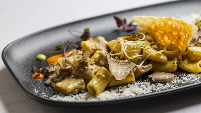 Maccheroncini all’uovo trafilati al bronzo con guanciale di vitello confit, al profumo di salvia e asiago