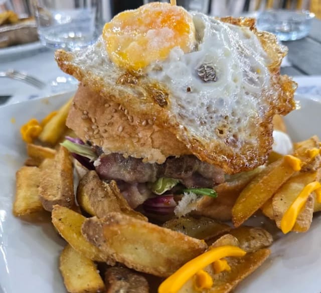 Bun 180 gr al sesamo cipolla caramellata bacon croccante hamburger 180 gr salsa barbecue lattuga iceberg maionese cheddar fuso uovo fritto contorno patate dippers