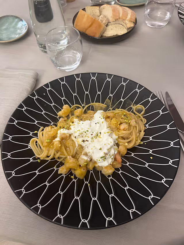 - Linguina al pesto di pistacchio e lime, gamberi e stracciatella