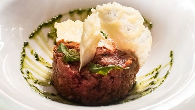 Battuto di manzo piemontese (100 g) con crema di robiola e lampone