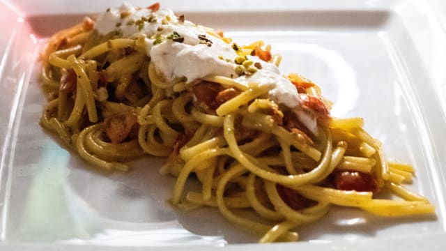 Linguina al pesto di pistacchio e lime, gamberi e stracciatella