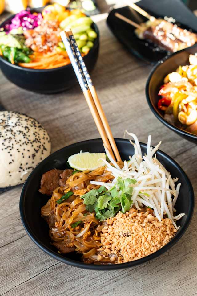 - Nouilles de riz, oeuf, germes de soja, cacahuètes grillées, ciboulette, ciboule