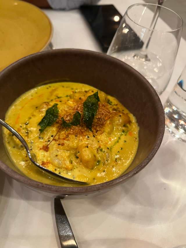 - Langostinos en curry moilee, con base de leche de coco, semilla de mostaza y cúrcuma.