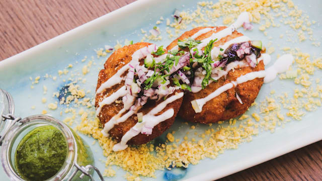 - Finos buñuelos crujientes de cebolla y especias, servidos con raita, chutney de tamarindo y menta.