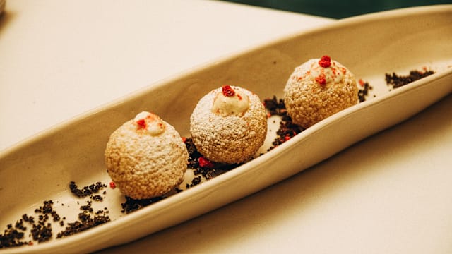 - Esferas crujientes rellenas de crema de mango, chantilly de lima, crumble de especias.
