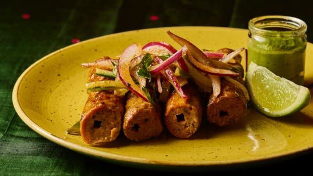 - Pollo marinado y asado al tandoor, acompañado de chutney de menta, cebolla encurtida y brotes frescos.