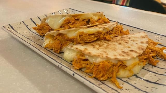 3 tortillas de harina, rellenas de queso fundido y lo que más te guste a elegir, acomoañadas de pico de gallo.