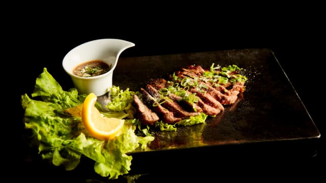 Pièce de faux-filet coupé en lamelles, poudre de riz, ciboulette, sauce tamarin citronnelle