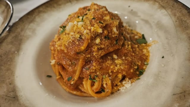 Spaghettone rustichella d abruzzo, pane tostato , aglio olio peperoncino e gamberetto spaghettone rustichella d'abruzzo with toasted bread , garlic, oil, chili and shrimp