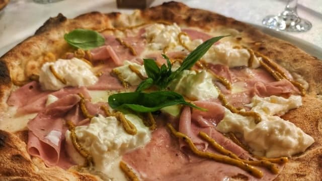 Fiordilatte 100% italiano, gorgonzola dop, sbriciolata di pecorino romano dop, taleggio lombardo dop, all,uscita scaglie di grana padano dop 24 mesi ,olio evo 100% italian fiordilatte, gorgonzola dop, crumbled pecorino romano dop, taleggio lombardo dop, flakes of grana padano dop 24 months ,oil evo