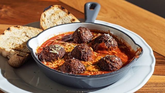 Polpette di manzo con salsa di pomodoro, pecorino romano dop e pane tostato