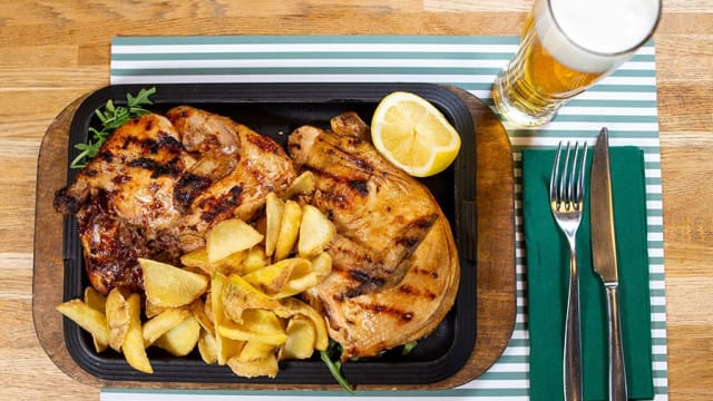 500 gr di polletto ruspante marinato e cotto alla brace accompagnato da salsa benvenuto e patatine fritte