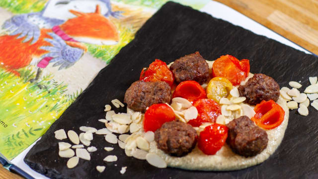 Polpette di manzo con salsa di pomodoro, pecorino romano DOP e pane tostato