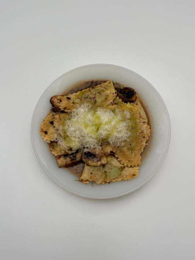- Ravioles, mantequilla de hongos, hongos en escabeche, reggianito, ciboulette