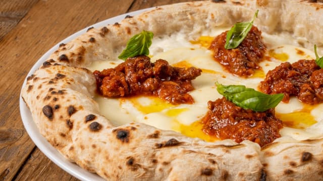Pomodoro pelato piccante, salsiccia pezzente selezione bertie’s, olive nere, fior di latte, basilico e olio evo