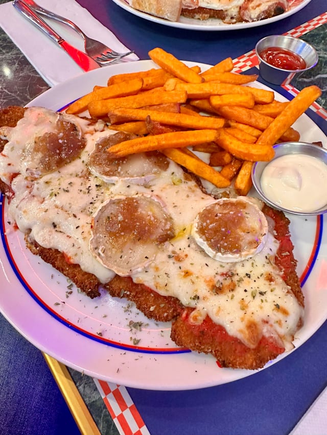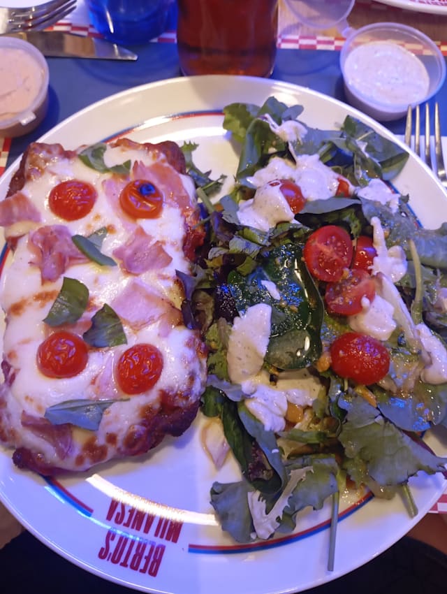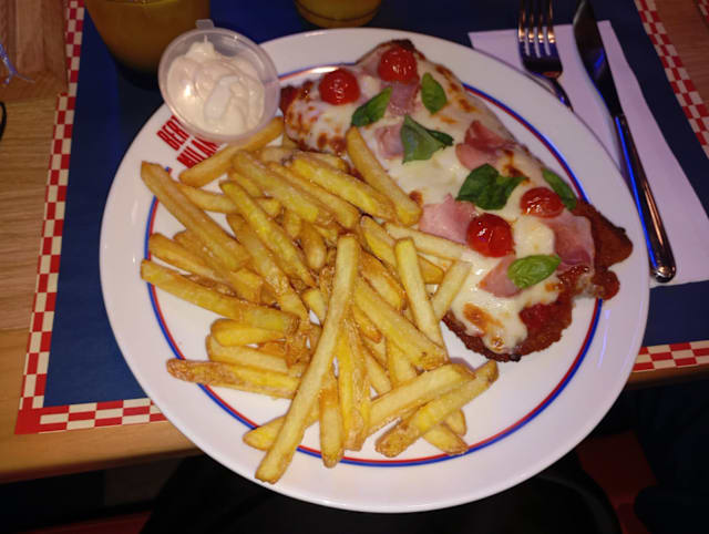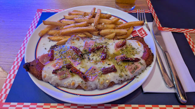 Milanesa de cerdo, tomate, mozzarella, tomate seco, mortadella y pesto de pistacchio. Incluye patatas fritas o ensalada